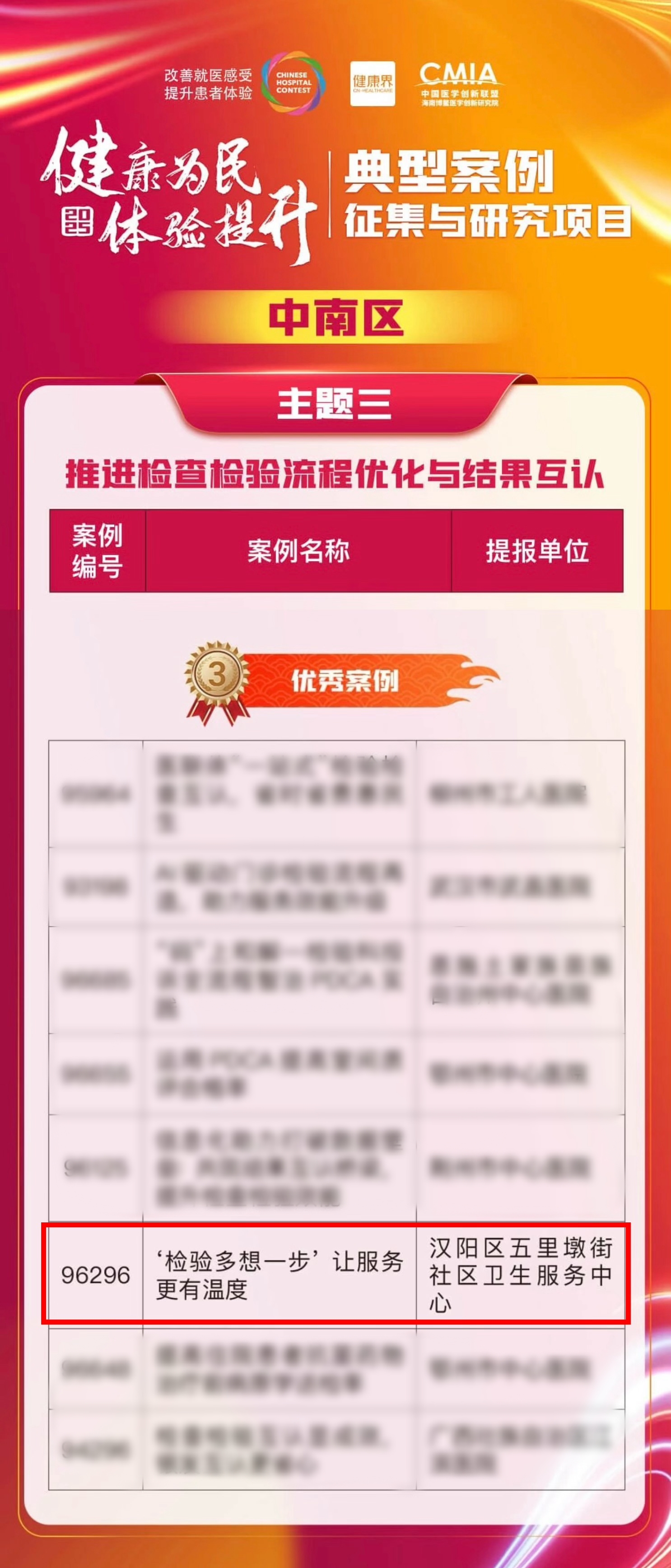 9月26日至27日,由国家卫健委医政司指导、健康界主办的2025“健康为民 体验提升”典型案例征集与研究项目中南赛区评审会在武汉举行。武汉市第五医院直管的五里墩街社区卫生服务中心(以下简称五里中心),所申报的“检验多想一步,让服务更有温度”项目,历经线上初评与现场专家评审,荣获“中南地区优秀案例”。