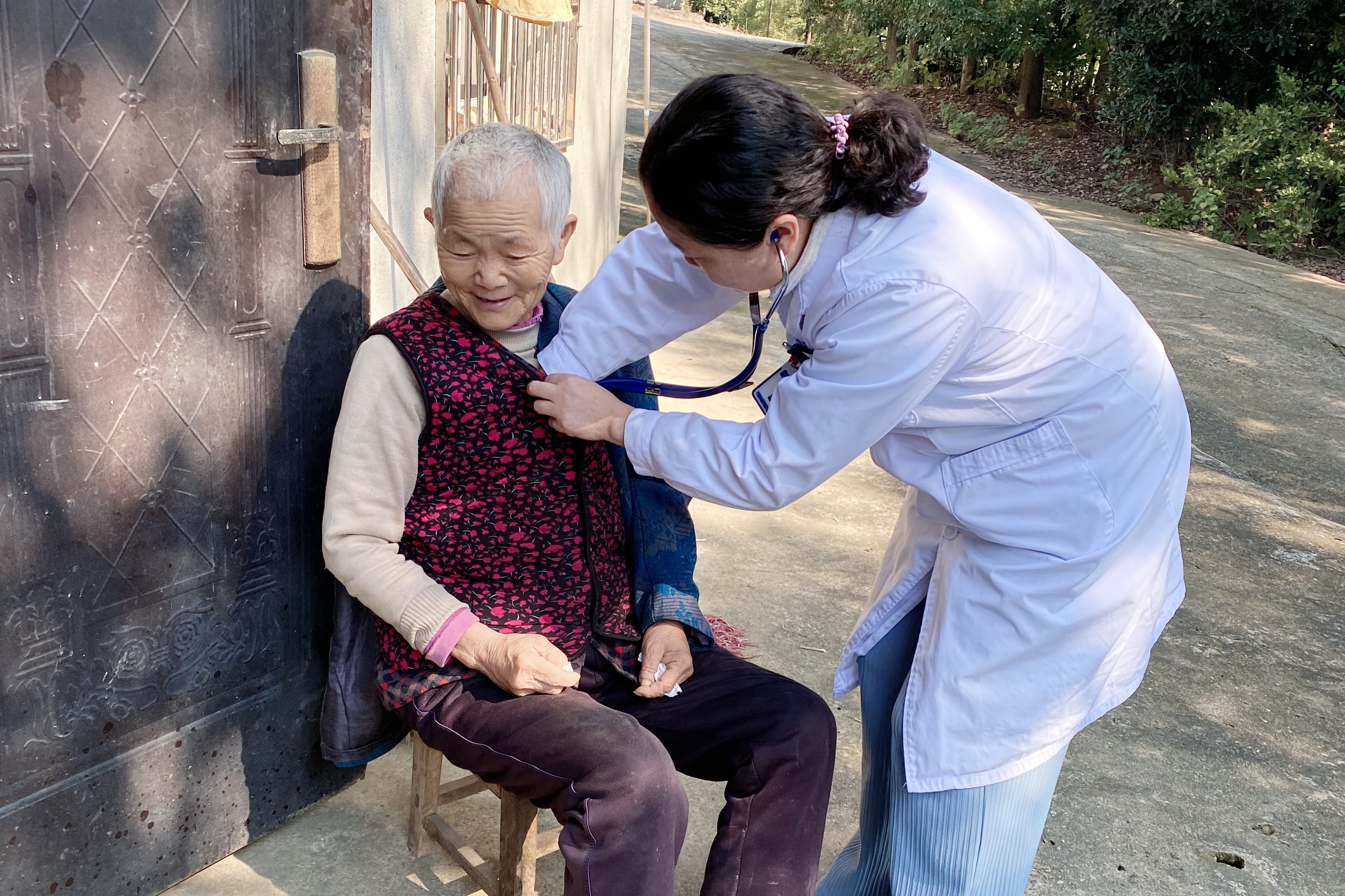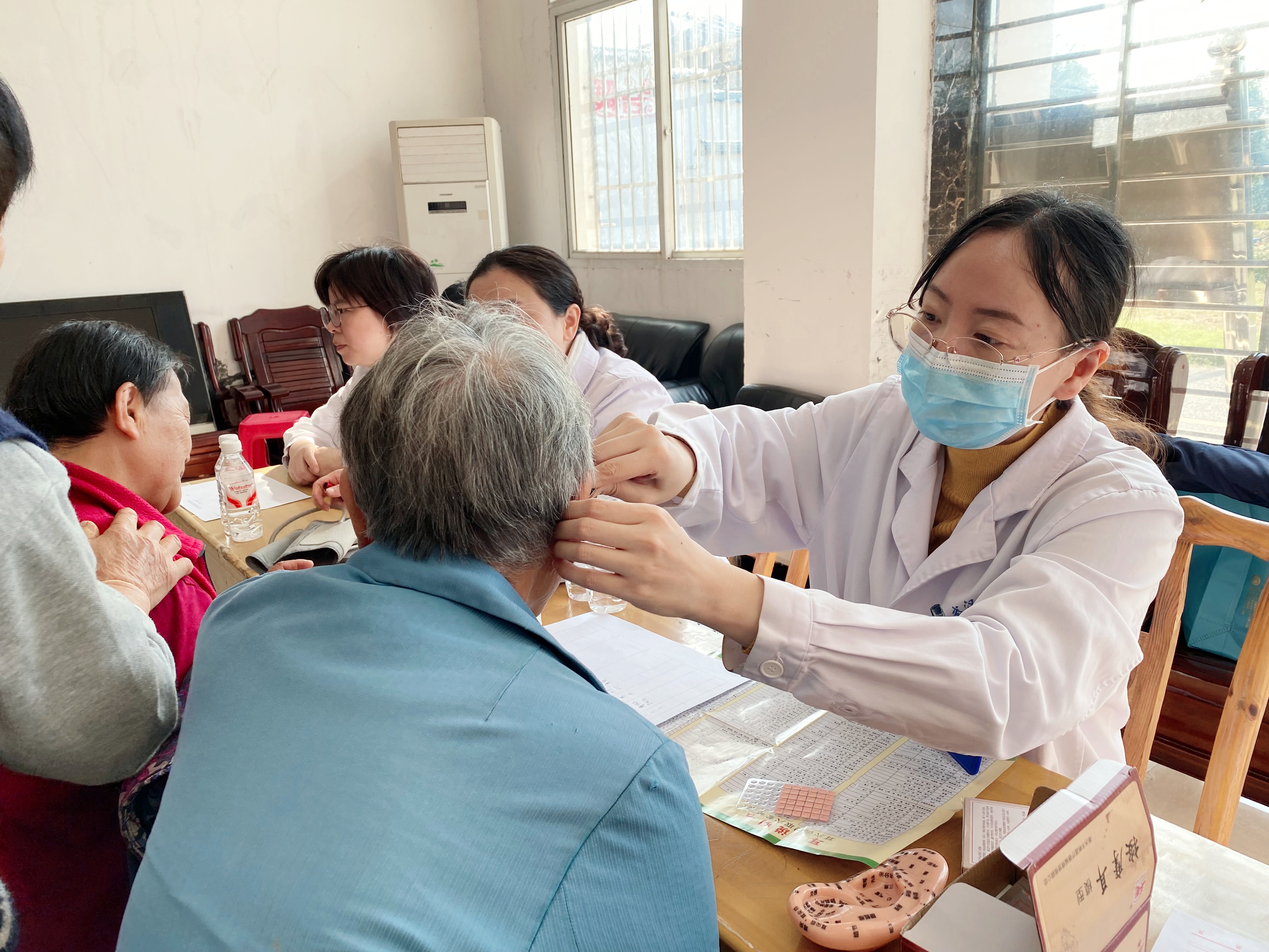 "您的高压160,低压97,平时要注意控制饮食、规律用药以及定期监测血压。"呼吸与危重症医学科主任刘丹一边在体检单上记录数据,一边向村民李奶奶叮嘱控制血压的注意事项。中医科医生杨晨为现场村民开展了耳穴敷贴治疗,重点针对村民普遍存在的睡眠障碍和疼痛不适问题进行干预。