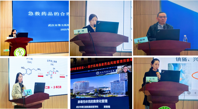 培训期间,药学部专家团队围绕急救药品全流程管理展开深度剖析。王懿睿副主任药师系统讲解“急救药品的合理使用及用药监护”;靳湘副主任药师分享“规范医疗机构抢救车与基数药品管理工作”经验;吴胜林主任药师提出“急救车药品科学配置与标准化管理”优化路径。晏妮、刘莉副主任药师分别就血管活性药物和急救状态下麻精药品管理使用进行专业阐述。临床专家郑先念、郭一新、周燕飞从不同维度探讨急救药物协同应用与风险防控。梁智雄副主任医师结合临床实际,深入讲解了“脓毒性休克的集束化管理”;长江航运总医院吴方建主任药师以蛇伤急救管理体系为例,分享“药学赋能急救”的创新实践,为基层提供“武汉经验”。武汉市第三医院副院长吴金虎在闭幕总结中高度评价,称培训理论与实践结合,为完善急救药品风险管理体系提供重要参考,推动区域医疗质量同质化。