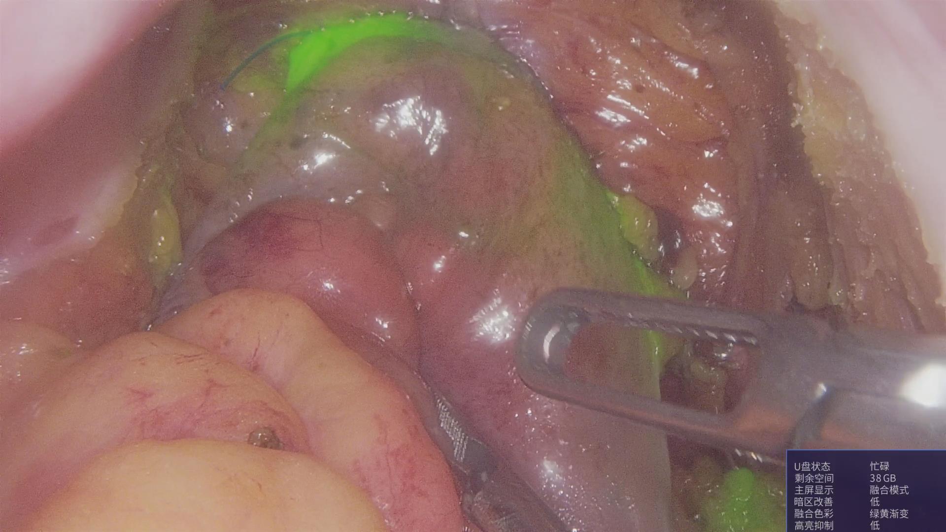 完成根治切除后,术中静脉注射吲哚菁绿,借助荧光腹腔镜实时观察肠管及吻合口血运情况。荧光成像显示吻合口区域显影延迟且不连续,提示局部血供不足。基于客观、直观的荧光评估结果,主刀医师果断施行末端回肠保护性造口,最大限度降低术后吻合口瘘的发生风险。