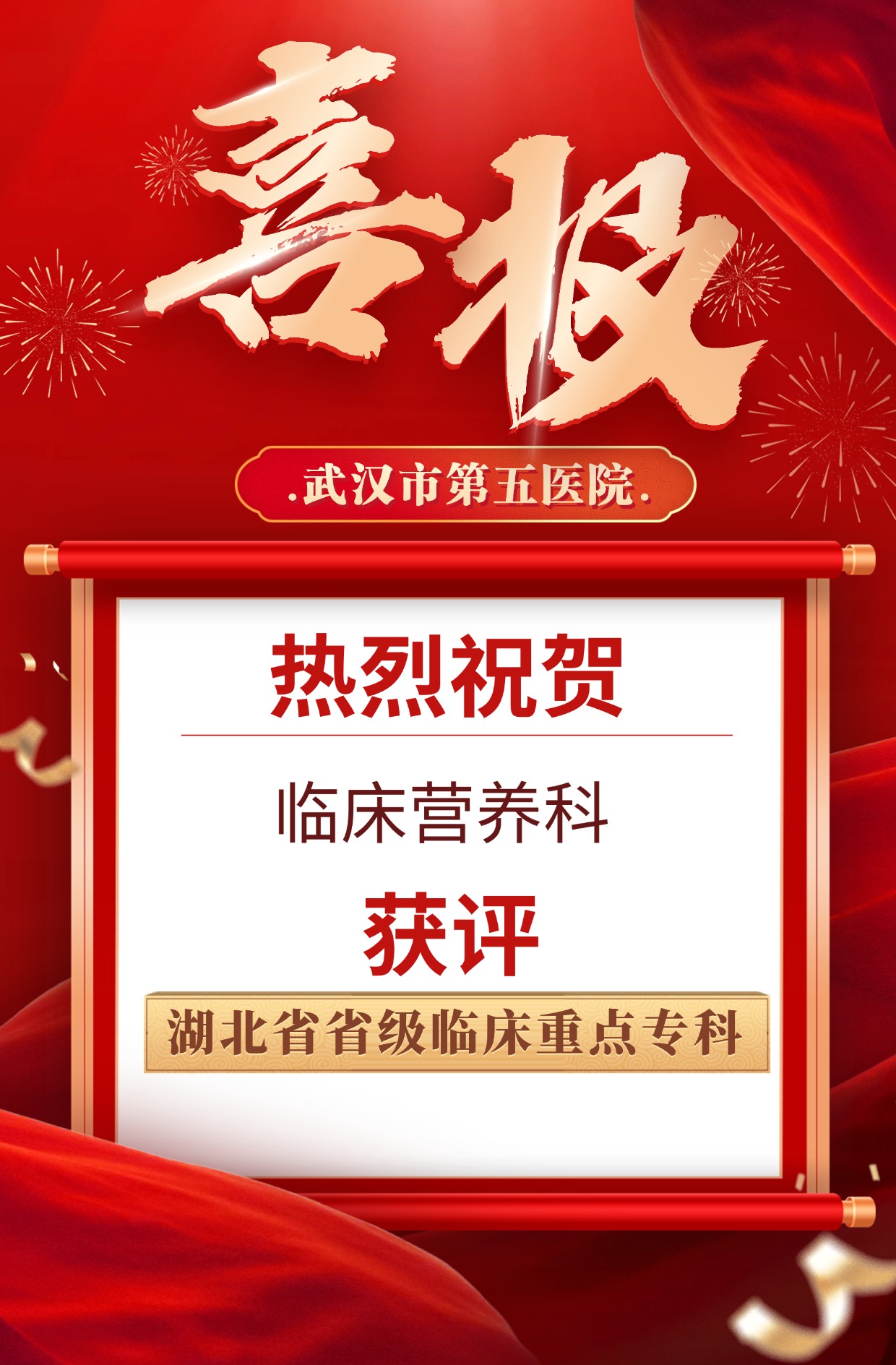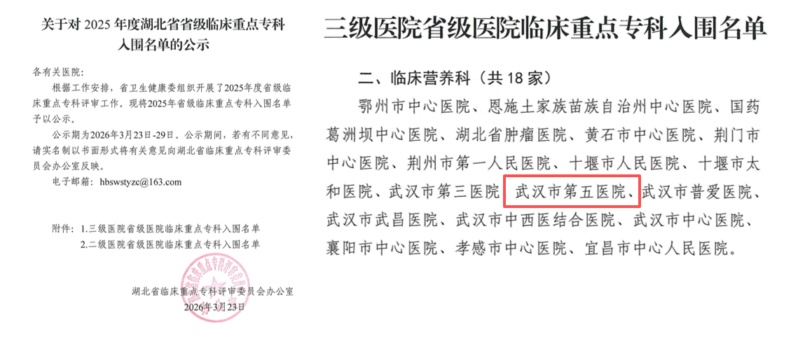 近日,湖北省临床重点专科评审委员会办公室发布了《关于对2025年湖北省省级临床重点专科入围名单的公示》,在2025年省级临床重点专科评审工作中,我院临床营养科成功获评湖北省省级临床重点专科。