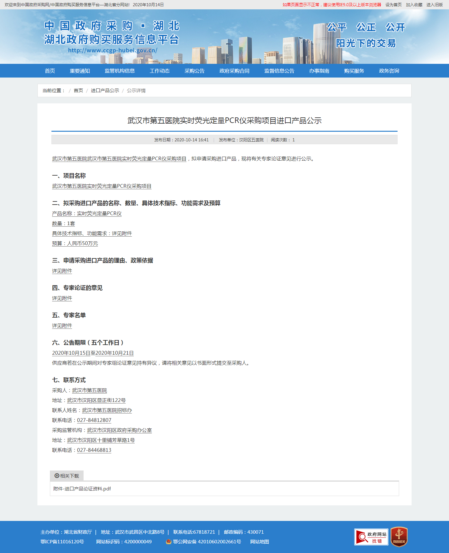 武汉市第五医院实时荧光定量PCR仪采购项目进口产品公示