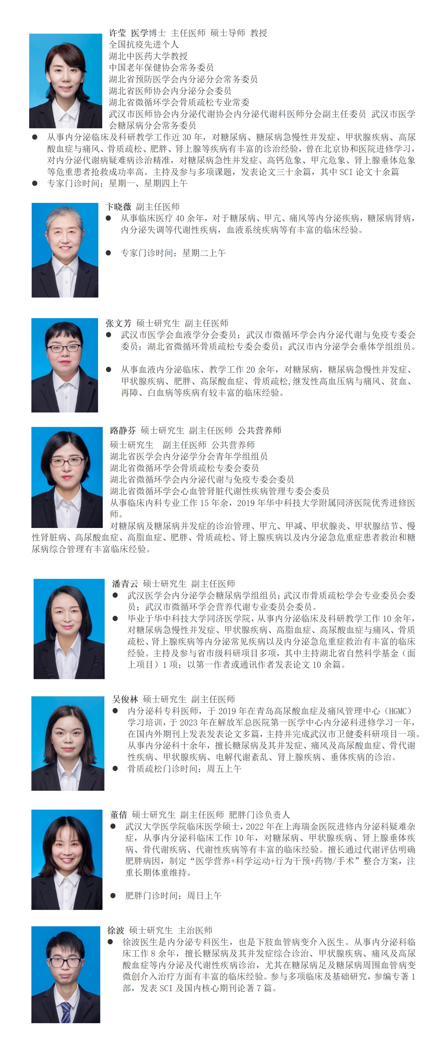 武汉市第五医院内分泌科历经多年积累,先后获评为湖北省重点专科、武汉市重点专科,国家代谢性疾病临床分中心。本科现有正高级职称医师1人,副高级职称医师6人,主治医师3人,住院医师2人。